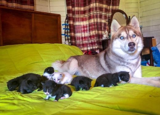 Una husky trova una scatola piena di gattini abbandonati e li adotta diventando la loro mamma