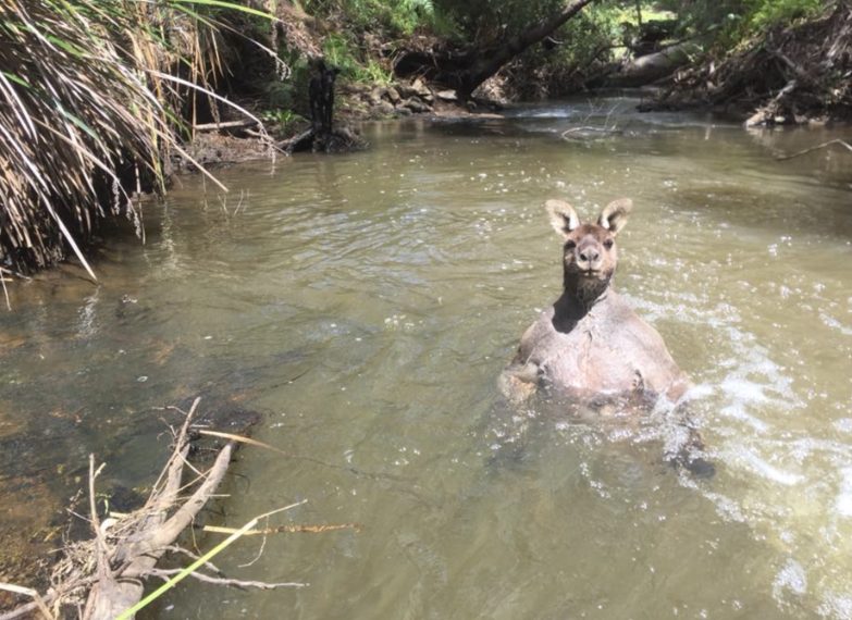 Probabilmente intento a refrigerarsi e anche pulirsi, questo esemplare di canguro è stato "scoperto" da un uomo che stava passeggiando in un bosco nei pressi di Boodjidup Creek, in una delle zone più "estreme" del continente australiano, nella parte sud occidentale a circa 200 km da Perth. La cosa che ha sorpreso la persona che ha scattato le foto è stato l'aspetto dell'animale, che è sembrato molto grande e "muscoloso", ma anche il fatto che non sembrava intimorito o aggressivo nei suoi confronti.