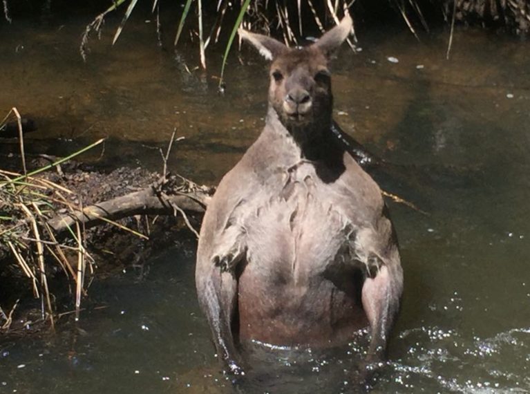 Probabilmente intento a refrigerarsi e anche pulirsi, questo esemplare di canguro è stato "scoperto" da un uomo che stava passeggiando in un bosco nei pressi di Boodjidup Creek, in una delle zone più "estreme" del continente australiano, nella parte sud occidentale a circa 200 km da Perth. La cosa che ha sorpreso la persona che ha scattato le foto è stato l'aspetto dell'animale, che è sembrato molto grande e "muscoloso", ma anche il fatto che non sembrava intimorito o aggressivo nei suoi confronti.
