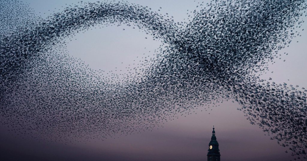 Gli storni si raggruppano a migliaia, formando una bellissima opera d'arte in cielo