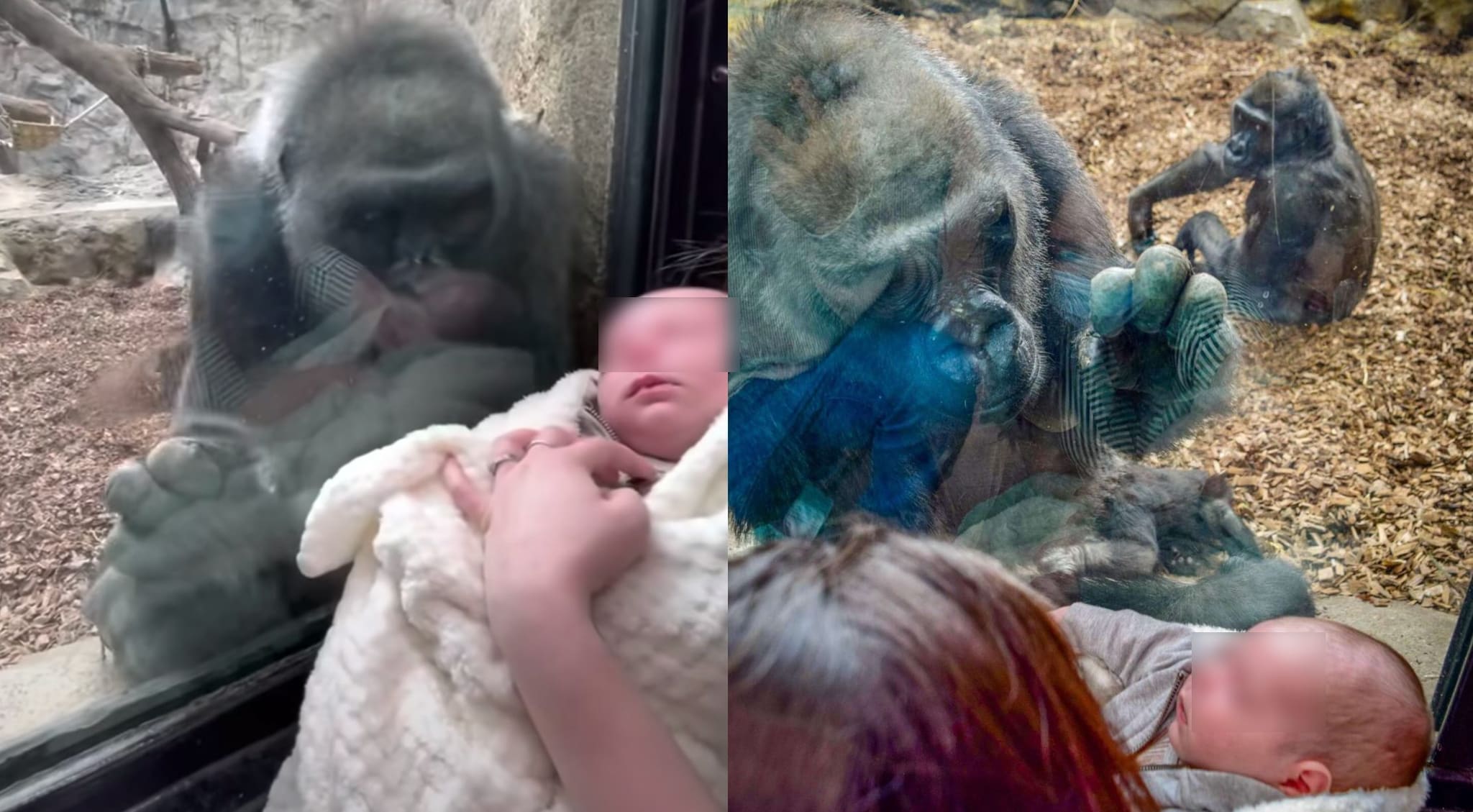 Negli USA da alcune settimane sono stati riaperti anche gli zoo e questa giovane coppia che ha avuto il loro primo figlio circa un mese fa, ha fatto visita al Franklin Park Zoo di Boston. Avvicinandosi al vetro che delimita il luogo dove vivono alcuni esemplari di gorilla, la donna tenendo in braccio il suo piccolo ha attirato l'attenzione di un esemplare di femmina adulta. Dopo alcuni minuti in cui il gorilla sembrava curioso e intenerito dal cucciolo umano. Poi ha permesso al suo cucciolo di avvicinarsi, quasi a volerlo mostrare all'altra persona, divenuta mamma come lei solo pochi giorni prima.