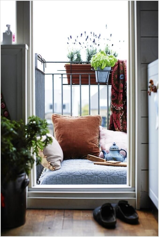 Per arredare il balcone può bastare anche qualche cuscino sul pavimento e tanta voglia di rilassarsi.