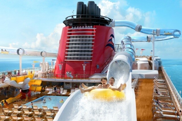 AquaDuck è uno scivolo per chi non ha paura delle altezze: posto a bordo della Disney Dream e Disney Fantasy, l'attrazione a picco sul mare consente di vedere tutto il mondo di sotto.