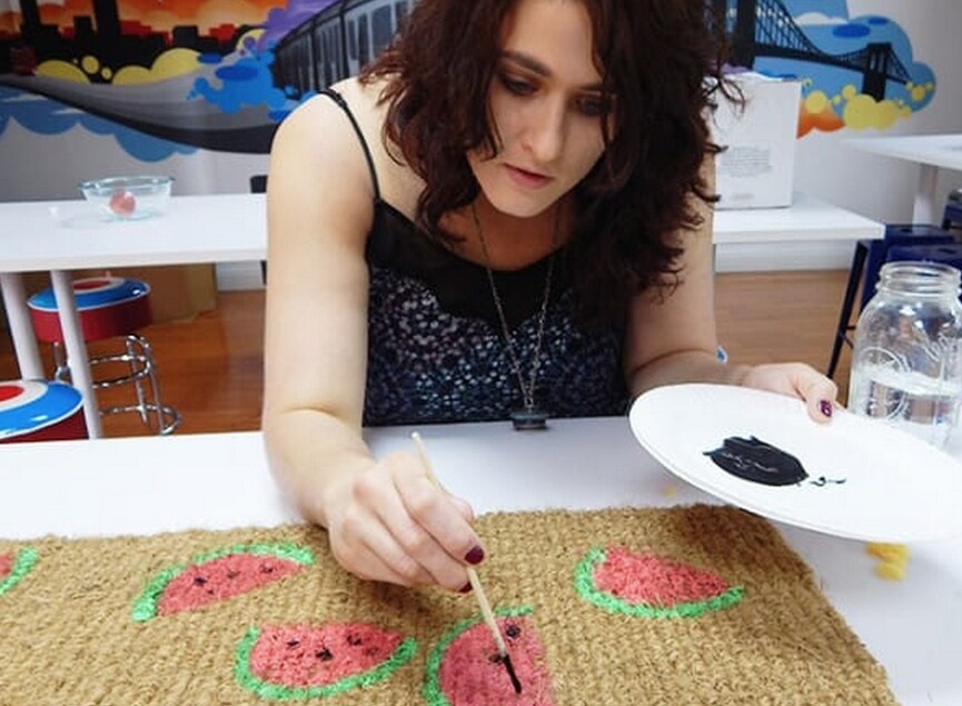 Una spugna usata come stencil per decorare un normale zerbino di corda e renderlo unico.