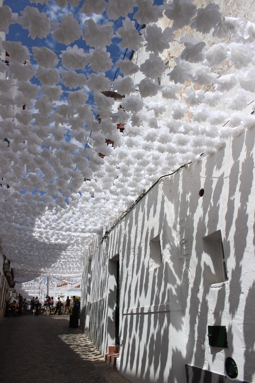Passeggiare sotto un tappeto di fiori di carta variopinti è un'emozione unica che potrete provare solo recandovi alla Festas do Povo di Alentejo, in Portogallo.