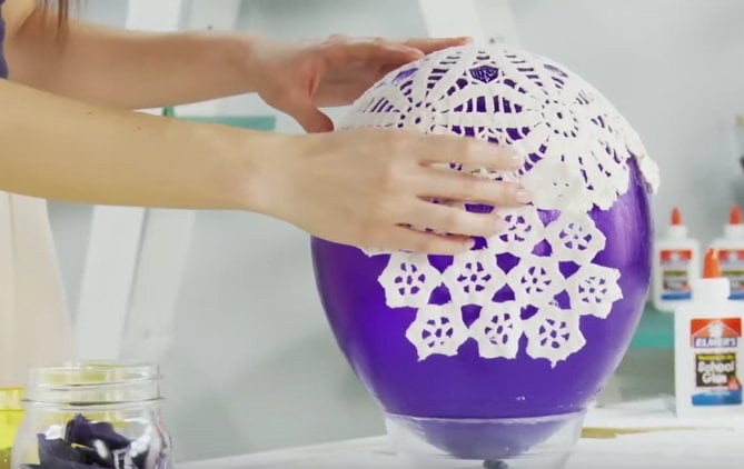 Incollare dei ricami su un palloncino e poi farlo scoppiare: quello che resta è un lampadario o meglio, una copertura intrigante per lampadina da appendere al soffitto.