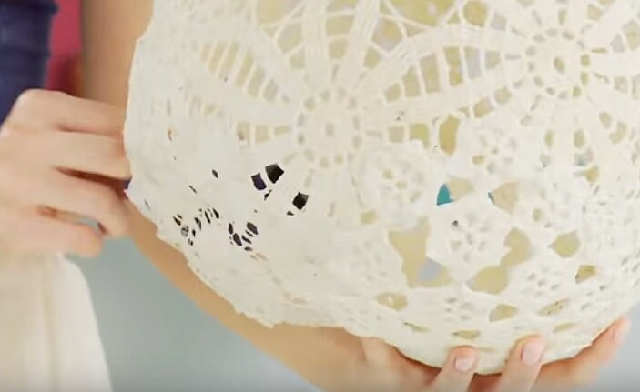 Incollare dei ricami su un palloncino e poi farlo scoppiare: quello che resta è un lampadario o meglio, una copertura intrigante per lampadina da appendere al soffitto.
