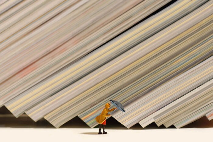Oggetti da ufficio, prodotti alimentari e altri elementi trovati vengono utilizzati da Tatsuya Tanaka come set perfetti delle sue scene di vita reale in miniatura.