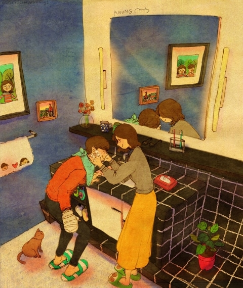 La vita di coppia diventa una storia illustrata nei disegni di Puuung che aggiunge nuove immagini alla sua serie "L'amore è nelle piccole cose" per dimostrare come i sentimenti si vedono nei gesti semplici.