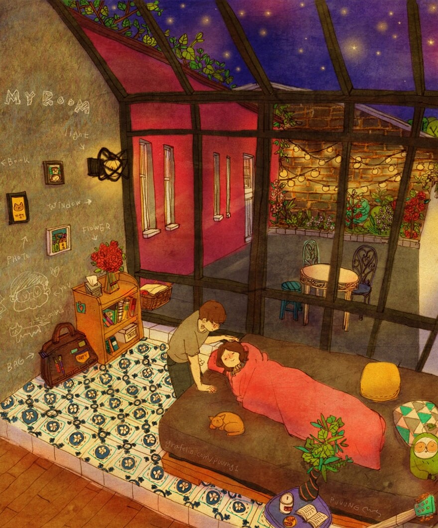 La vita di coppia diventa una storia illustrata nei disegni di Puuung che aggiunge nuove immagini alla sua serie "L'amore è nelle piccole cose" per dimostrare come i sentimenti si vedono nei gesti semplici.