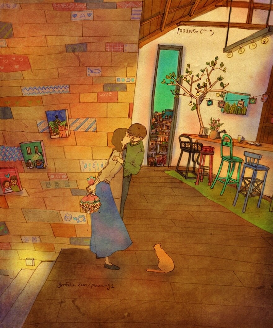 La vita di coppia diventa una storia illustrata nei disegni di Puuung che aggiunge nuove immagini alla sua serie "L'amore è nelle piccole cose" per dimostrare come i sentimenti si vedono nei gesti semplici.