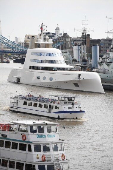 Tutti a bocca aperta nei pressi della Tower Bridge di Londra quando c'è stato il passaggio del gigantesco yacht del magnate russo Andrey Melnichenko, noto come ‘King of Bling’, Re del lusso. Misura 119 metri ed è uno dei 25 superyacht più lunghi al mondo. Progettato da Philippe Starck all'interno presenta mobili in legno, i divani in pelle, i letti rotanti, i vetri antiproiettili.