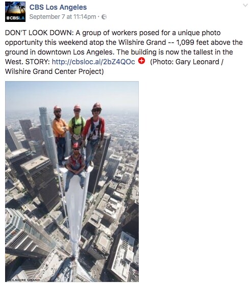 Sicuramente per lavorare a quelle altezze on bisogna soffrire di vertigini, ma la foto che ritrae questi 4 operai di Los Angeles è davvero impressionante. Fermi su una piccola guglia, si fanno fotografare come se si trovassero in un luogo "normale", mentre in realtà si trovano in cima all'imponente Wilshire Grand Tower.