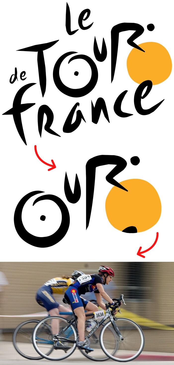 Il logo del Tour de France deriva dall'immagine stilizzata di un ciclista in biciletta che è racchiusa nella parola "tour" stessa.