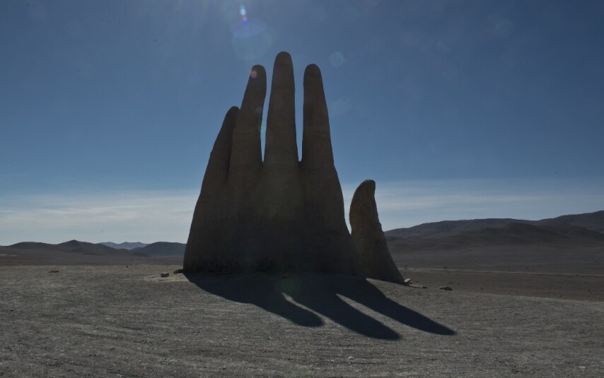 Dalla sabbia del deserto di Atacama, in Cile, emerge una mano umana alta 11 metri che non è una reliquia antica né un'allucinazione ma un'opera dello scultore Mario Irarrázabal, realizzata nel 1992 nel deserto di Atacama, in Cile, a 75 chilometri dalla città di Antofagasta, sulla Route 5 della Panamericana. La Mano del Desierto "è il collegamento tra l'uomo e l'universo".