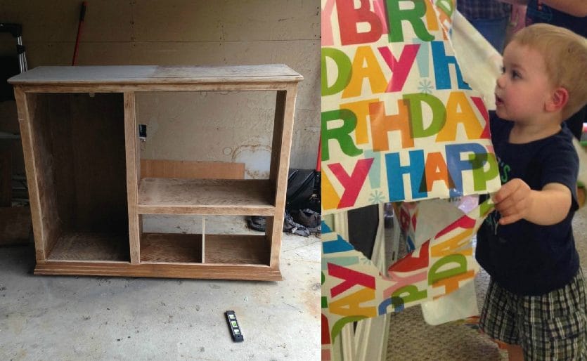 Un progetto fai da te per un regalo originale al figlio: un semplice mobile viene levigato e lavorato per bene ed è completamente trasformato. In occasione del suo secondo anno di età, il piccolo ha avuto in dono una cucina con cui potersi divertire. Un regalo neanche troppo costoso: 20 dollari circa la spesa per i materiali utilizzati.