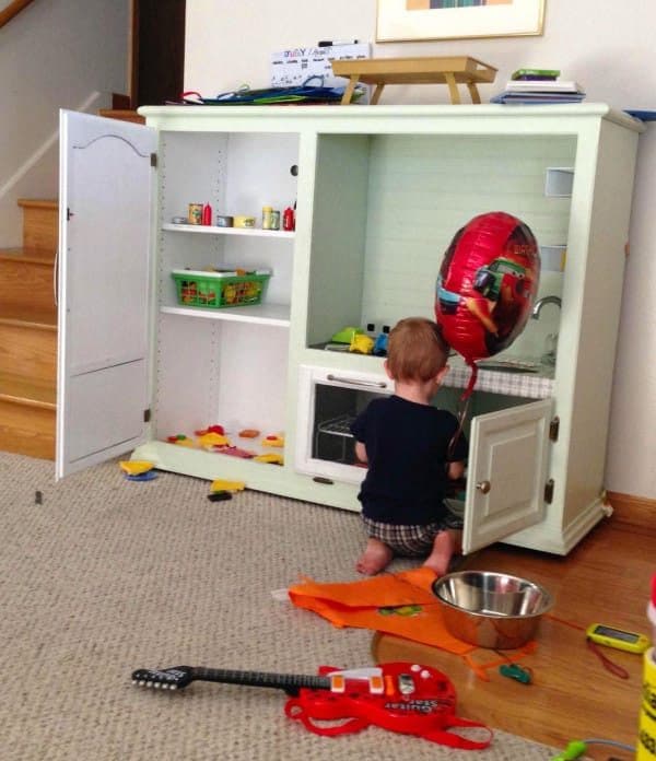 Un progetto fai da te per un regalo originale al figlio: un semplice mobile viene levigato e lavorato per bene ed è completamente trasformato. In occasione del suo secondo anno di età, il piccolo ha avuto in dono una cucina con cui potersi divertire. Un regalo neanche troppo costoso: 20 dollari circa la spesa per i materiali utilizzati.