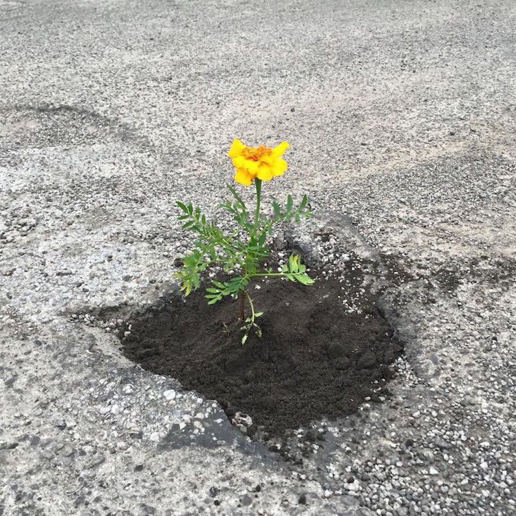 L'arte che ripara le buche stradali con i fiori