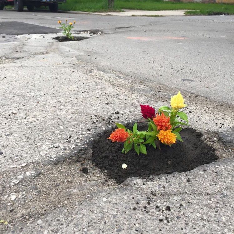 L'arte che ripara le buche stradali con i fiori