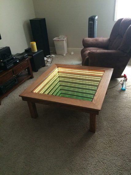 Una bellissima idea per il soggiorno è rappresentato da questa installazione. Più che un semplice tavolino: le immagini mostrano le varie fasi di lavorazione, dall'installazione dei piedi fino ai fori necessari per far passare il cavo di alimentazione; al termine della lavorazione viene installato uno schermo led: quando si illumina di notte, l'effetto è davvero suggestivo.