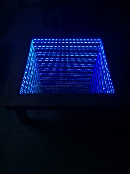 Una bellissima idea per il soggiorno è rappresentato da questa installazione. Più che un semplice tavolino: le immagini mostrano le varie fasi di lavorazione, dall'installazione dei piedi fino ai fori necessari per far passare il cavo di alimentazione; al termine della lavorazione viene installato uno schermo led: quando si illumina di notte, l'effetto è davvero suggestivo.