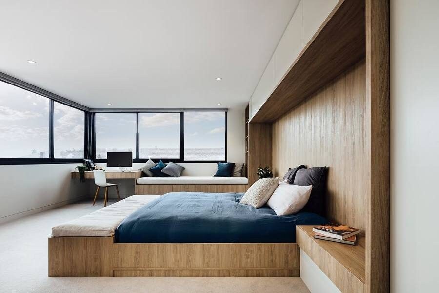 Quando c’è spazio si può pensare ad una grande testata come quella della foto che copre la superficie del letto e raggiunge quasi il pavimento. In questo caso si possono sfruttare i due ripiani che sono stati creati per l'archiviazione, sia nella parte superiore che in quella inferiore.