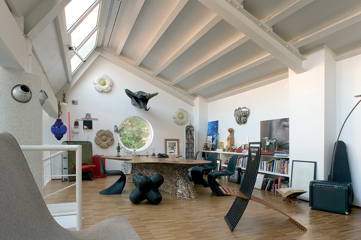 Su uno dei due soppalchi del capannone pavimentati in teak, come un grande tronco tagliato, con la forma dell’isola di Capri, trova posto il tavolo-scrivania che Fabio Novembre si è disegnato per sé, realizzato in radica e mosaico (prod. Bisazza). Attorno ad esso numerose sedie d’autore: “Panton Chair” di Verner Panton (prod. Vitra), Pylon Chair di Tom Dixon ( prod. Cappellini), “Smorfia” di Gaetano Pesce (prod. Meritalia). Sulla postazione di lavoro di Fabio Novembre campeggia un grande serpe