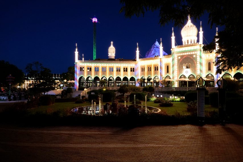 Di notte ai giardini di Tivoli a Copenhagen, il parco divertimenti che sembra uscito da una fiaba