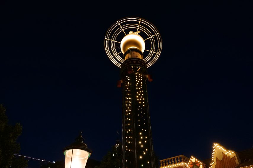 Di notte è il momento più suggestivo per visitare i Giardini di Tivoli perché le migliaia di luci colorate creano un'atmosfera da favola assolutamente unica. Il parco riesce a catturare l'immaginazione e renderla realtà grazie ai numerosi dettagli da scoprire, come, ad esempio, come la presenza di veri animali, le faraone, che corrono liberamente attraverso i giardini. Le giostre sono tutte progettate per adattarsi all'architettura e ai giardini di Tivoli. Alcune giostre sono meravigliosamente nostalgiche, mentre altre soddisferanno le aspettative dei più esigenti amanti del brivido. La giostra più antica e popolare di Tivoli, le montagne russe in legno del 1914, è una delle sole sette montagne russe al mondo che hanno un frenatore a bordo di ogni treno. Sono presenti anche giostre da brividi come Vertigo, che viaggia a 100 km/h. Nel 2021 è stata inaugurata l'ultima giostra del parco, Villa Vendetta, la più grande casa spaventosa permanente della Danimarca con attori e molto altro.