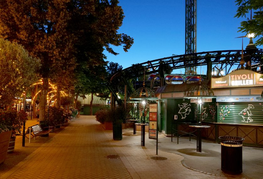 Di notte è il momento più suggestivo per visitare i Giardini di Tivoli perché le migliaia di luci colorate creano un'atmosfera da favola assolutamente unica. Il parco riesce a catturare l'immaginazione e renderla realtà grazie ai numerosi dettagli da scoprire, come, ad esempio, come la presenza di veri animali, le faraone, che corrono liberamente attraverso i giardini. Le giostre sono tutte progettate per adattarsi all'architettura e ai giardini di Tivoli. Alcune giostre sono meravigliosamente nostalgiche, mentre altre soddisferanno le aspettative dei più esigenti amanti del brivido. La giostra più antica e popolare di Tivoli, le montagne russe in legno del 1914, è una delle sole sette montagne russe al mondo che hanno un frenatore a bordo di ogni treno. Sono presenti anche giostre da brividi come Vertigo, che viaggia a 100 km/h. Nel 2021 è stata inaugurata l'ultima giostra del parco, Villa Vendetta, la più grande casa spaventosa permanente della Danimarca con attori e molto altro.