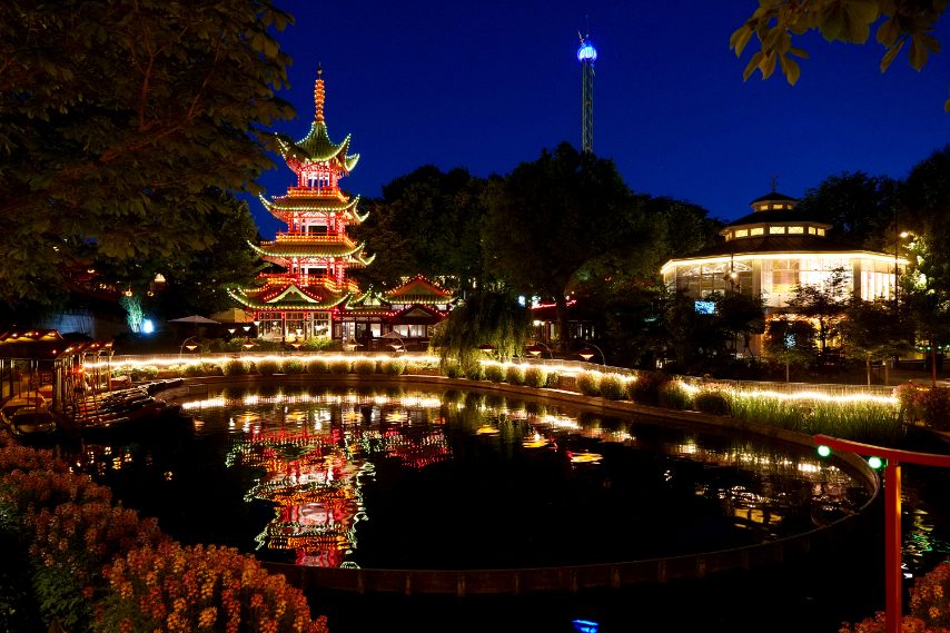 Di notte ai giardini di Tivoli a Copenhagen, il parco divertimenti che sembra uscito da una fiaba