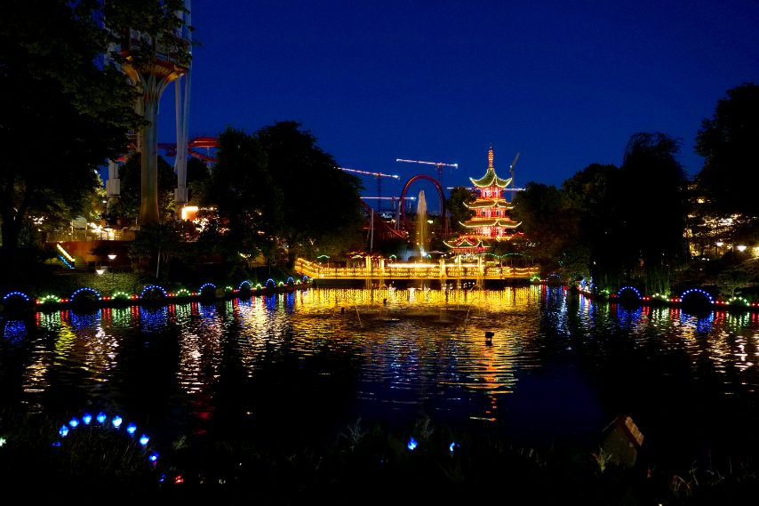 Di notte ai giardini di Tivoli a Copenhagen, il parco divertimenti che sembra uscito da una fiaba