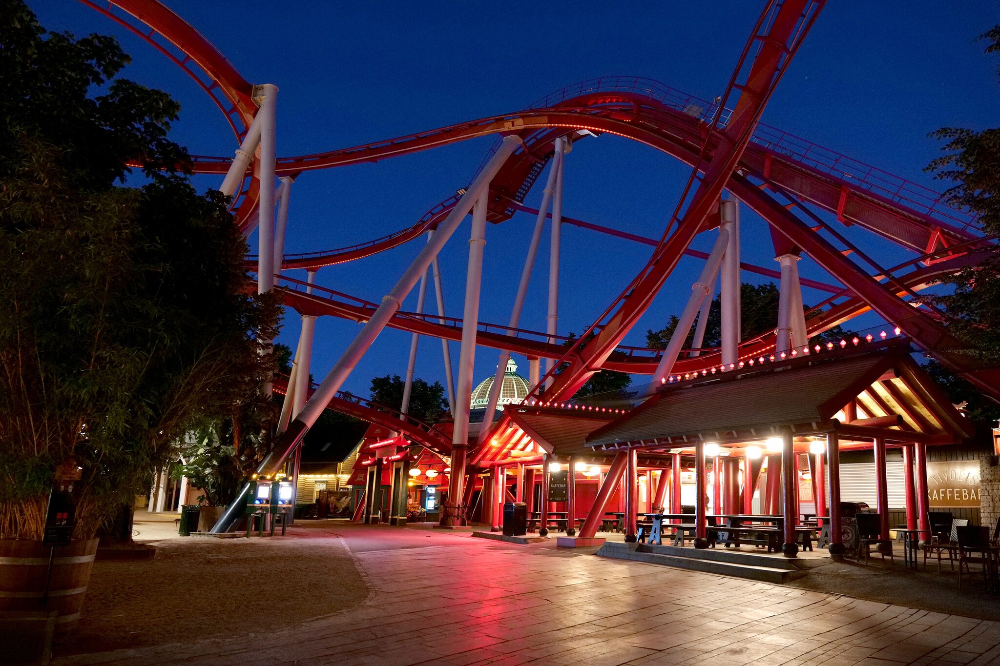 Di notte è il momento più suggestivo per visitare i Giardini di Tivoli perché le migliaia di luci colorate creano un'atmosfera da favola assolutamente unica. Il parco riesce a catturare l'immaginazione e renderla realtà grazie ai numerosi dettagli da scoprire, come, ad esempio, come la presenza di veri animali, le faraone, che corrono liberamente attraverso i giardini. Le giostre sono tutte progettate per adattarsi all'architettura e ai giardini di Tivoli. Alcune giostre sono meravigliosamente nostalgiche, mentre altre soddisferanno le aspettative dei più esigenti amanti del brivido. La giostra più antica e popolare di Tivoli, le montagne russe in legno del 1914, è una delle sole sette montagne russe al mondo che hanno un frenatore a bordo di ogni treno. Sono presenti anche giostre da brividi come Vertigo, che viaggia a 100 km/h. Nel 2021 è stata inaugurata l'ultima giostra del parco, Villa Vendetta, la più grande casa spaventosa permanente della Danimarca con attori e molto altro.