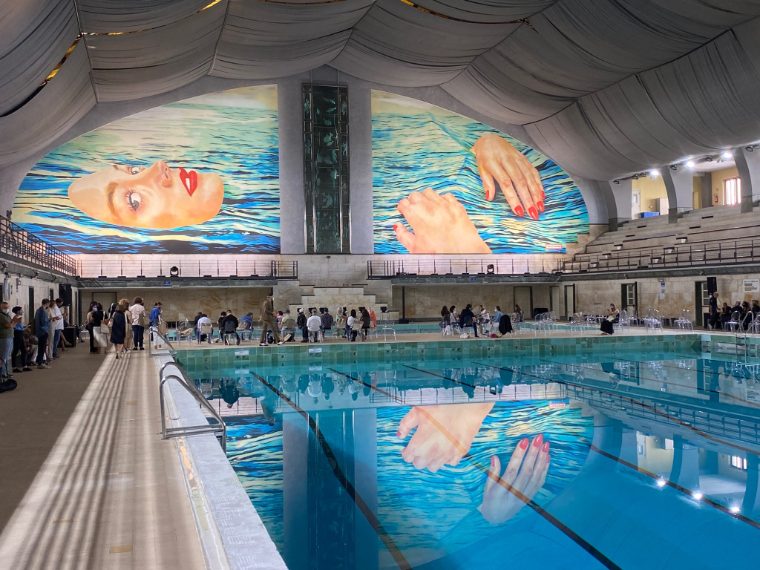 Cattelan si veste da bagnino per l'inaugurazione dell'opera Be Water alla Piscina Cozzi di Milano