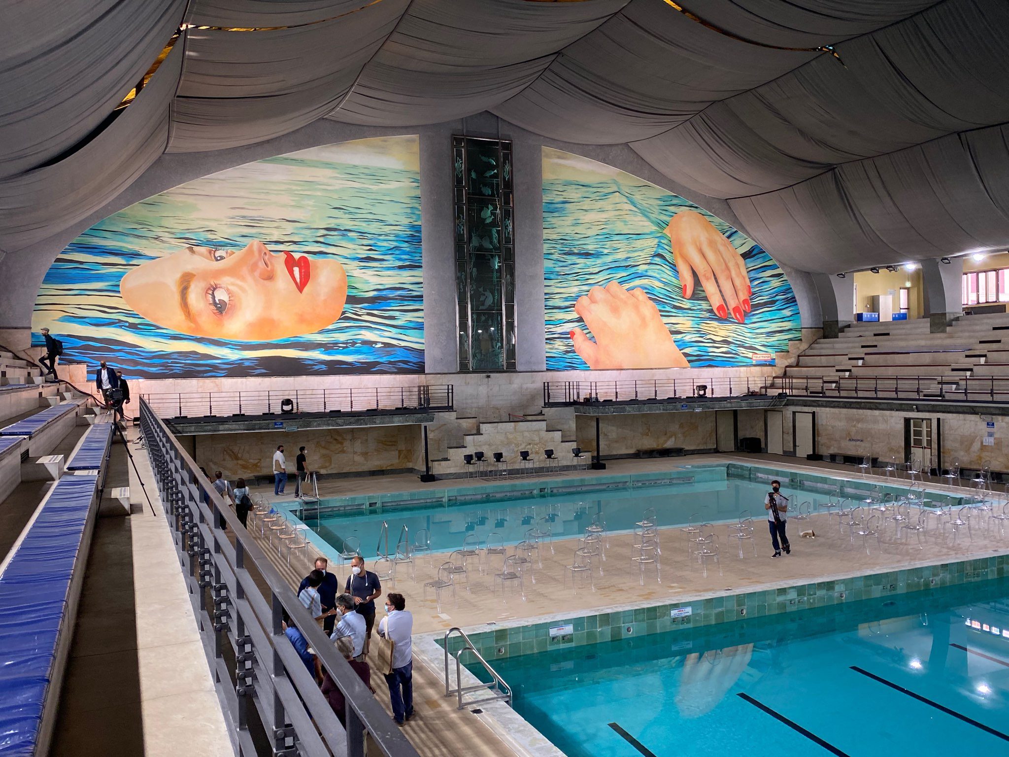 Cattelan si veste da bagnino per l'inaugurazione dell'opera Be Water alla Piscina Cozzi di Milano