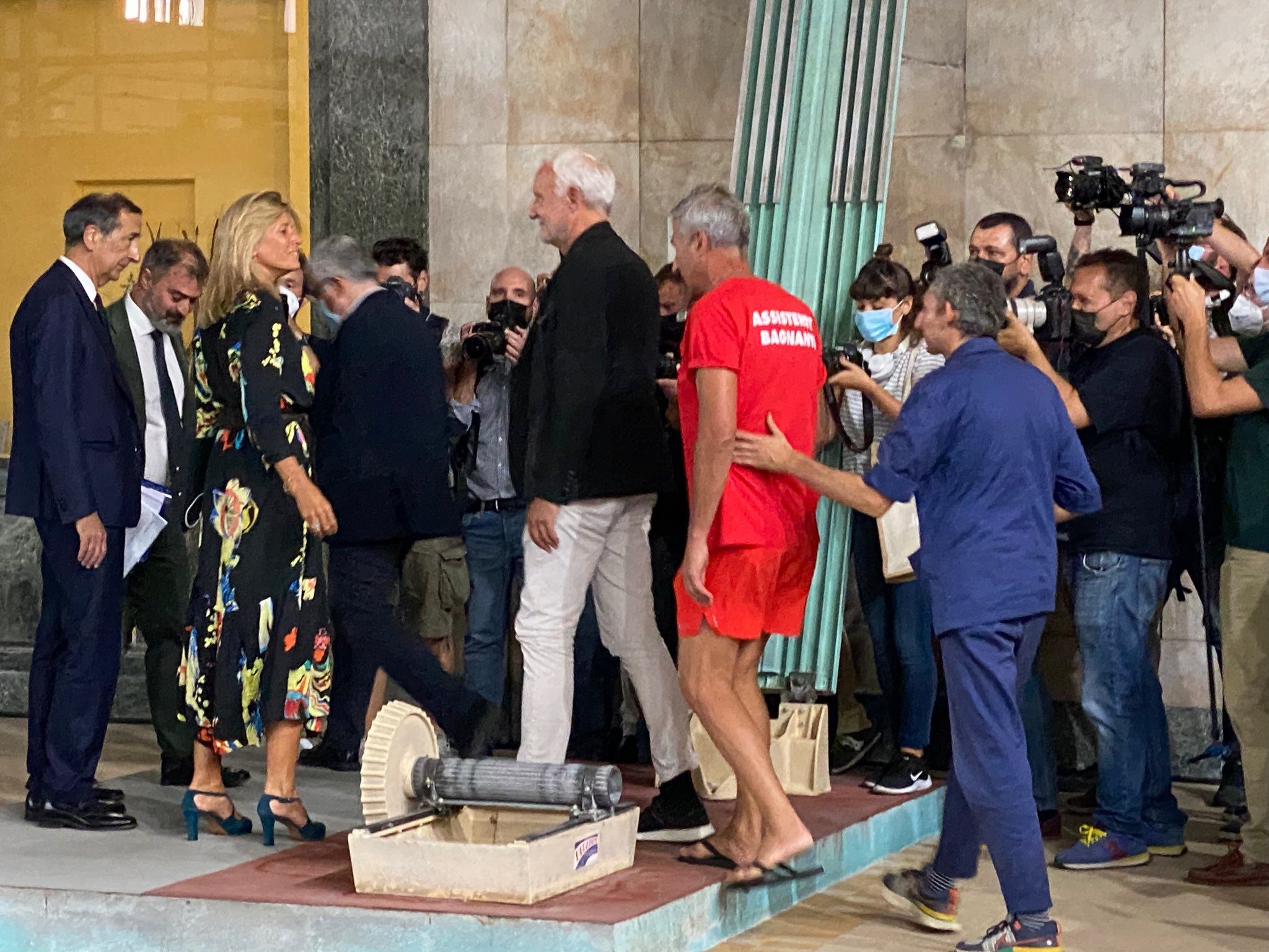 Cattelan si veste da bagnino per l'inaugurazione dell'opera Be Water alla Piscina Cozzi di Milano
