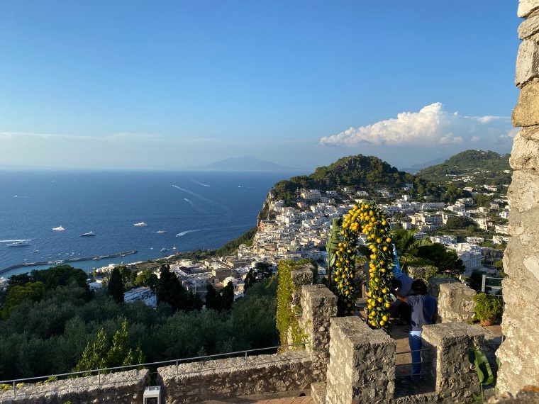 Quando si arriva a Capri già dal mare si resta incantati dalla bellezza del paesino di case bianche arroccate sulla scogliera, i colori della roccia in contrasto con la vegetazione rigogliosa. Sulla cima maestosa che domina il comune non passa inosservata una robusta fortezza da cui sembra possibile toccare il cielo. Si tratta di Villa Castiglione che, sui resti di un tempio greco e di una villa romana, poi castello difensivo dell'isola, è diventato un hotel di lusso e location di eventi esclusivi con vista su uno dei panorami più incredibili del Mediterraneo.