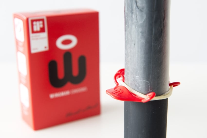 Il profilattico "con le ali", ideato da un designer olandese promette di farsi indossare senza problemi né rotture con due dita. È stato presentato ad una fiera internazionale ad Hannover. (AFP PHOTO / ANP / LEX VAN LIESHOUT)