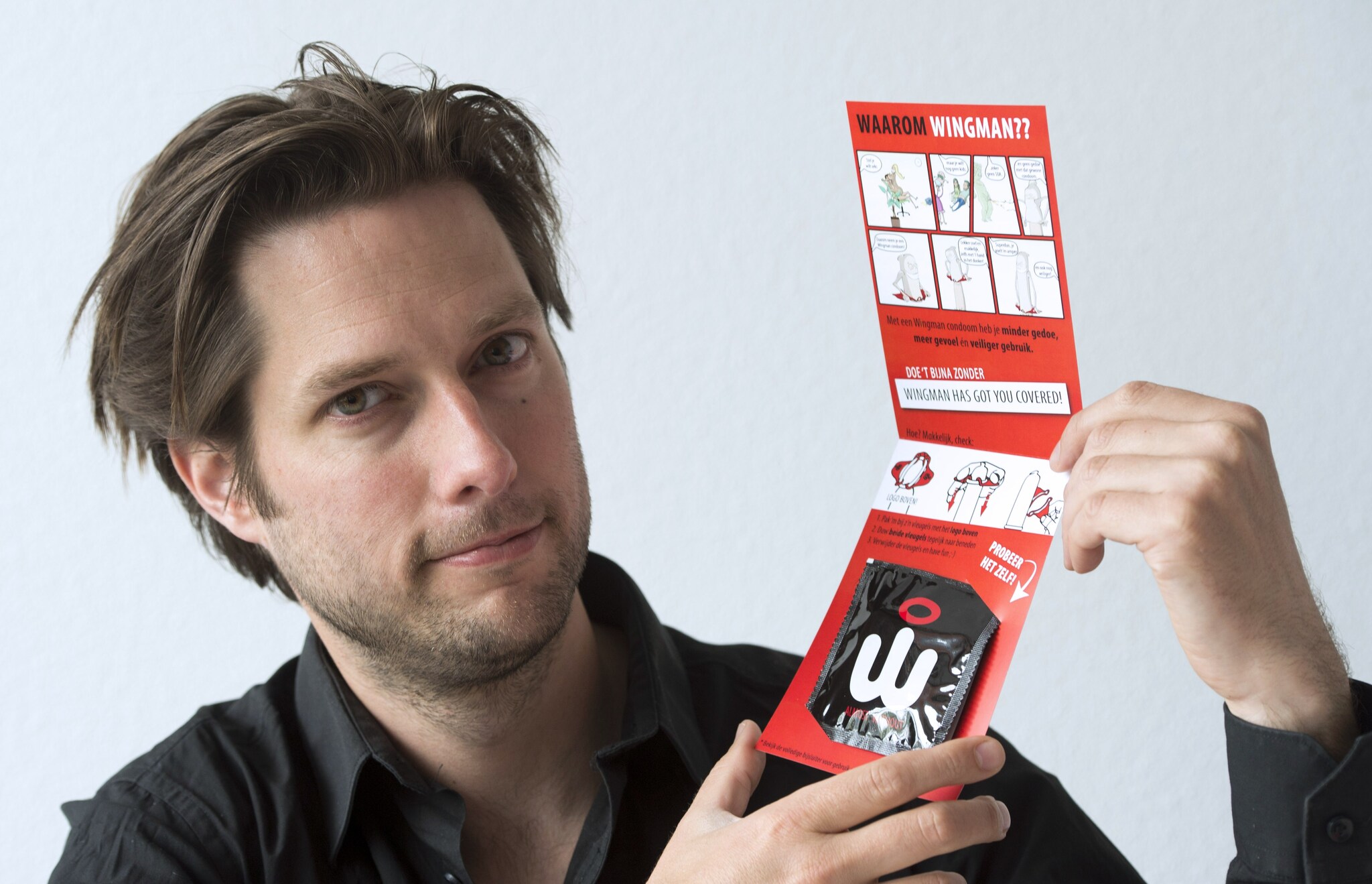 Il profilattico "con le ali", ideato da un designer olandese promette di farsi indossare senza problemi né rotture con due dita. È stato presentato ad una fiera internazionale ad Hannover. (AFP PHOTO / ANP / LEX VAN LIESHOUT)