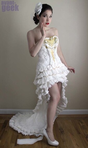 Ci sono voluti ben undici rotoli di carta igienica, metri e metri di nastro adesivo e centinaia di ore di lavoro per realizzare il primo abito da sposa di carta