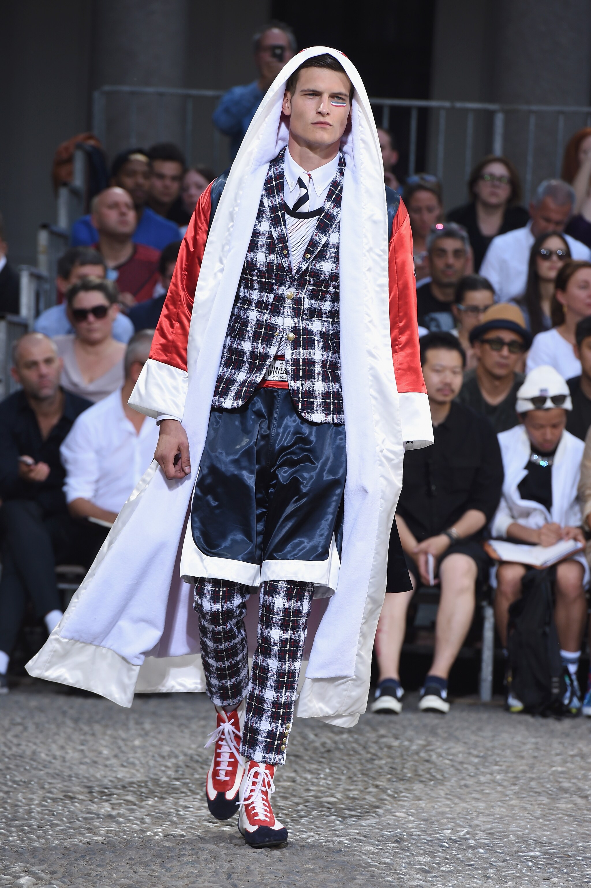 Lo stilista di Moncler Gamme Bleu, Thom Browne, per creare la nuova collezione Primavera/Estate 2015 si ispira al mondo della boxe e presenta, su una passerella trasformata in ring, capi sportivi dal sapore couture, rivisti e corretti in chiave chic ed anticonvenzionale.