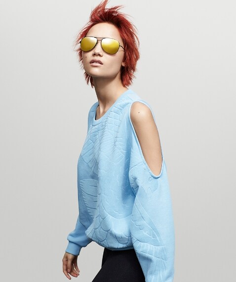 Sfumature pastello ispirate al tramonto decorano felpe con maniche a pispistrello e body, mentre blocchi di colore acceso, rosa, blu e gialli, accostati ad un nero intenso, caratterizzano maxi shirt, jumpsuit e leggings.