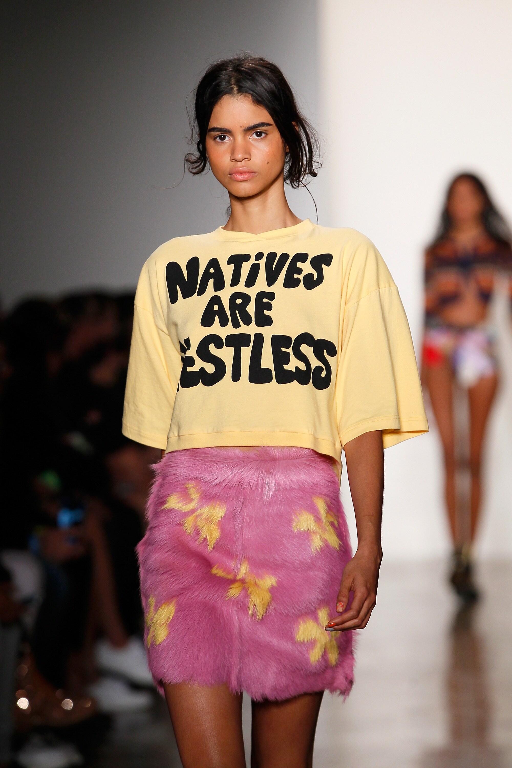 La popstar si è trasformata in modella per un giorno salendo sulla passerella newyorchese dell'amico stilista Jeremy Scott. Ecco il look inconsueto esibito da Miley Cyrus sul catwalk.
