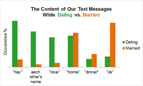Il modo di comunicare in un rapporto di coppia cambia con il passare del tempo: analizzando gli sms inviati notiamo quali sono le parole più utilizzate prima e dopo il matrimonio.