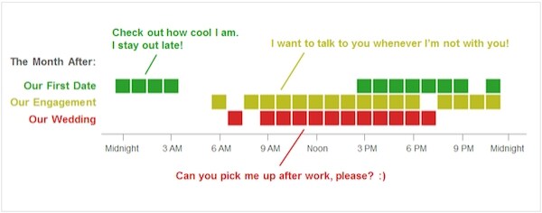 Il modo di comunicare in un rapporto di coppia cambia con il passare del tempo: analizzando gli sms inviati notiamo quali sono le parole più utilizzate prima e dopo il matrimonio.
