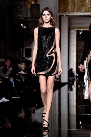 Apre la Settimana dell'Alta Moda di Parigi la sfilata Primavera/Estate 2015 di Versace Atelier. In passerella sfila una donna sensuale che indossa lunghi abiti da sera con ampi spacchi, trasparenze e cut dalle forme sinuose.