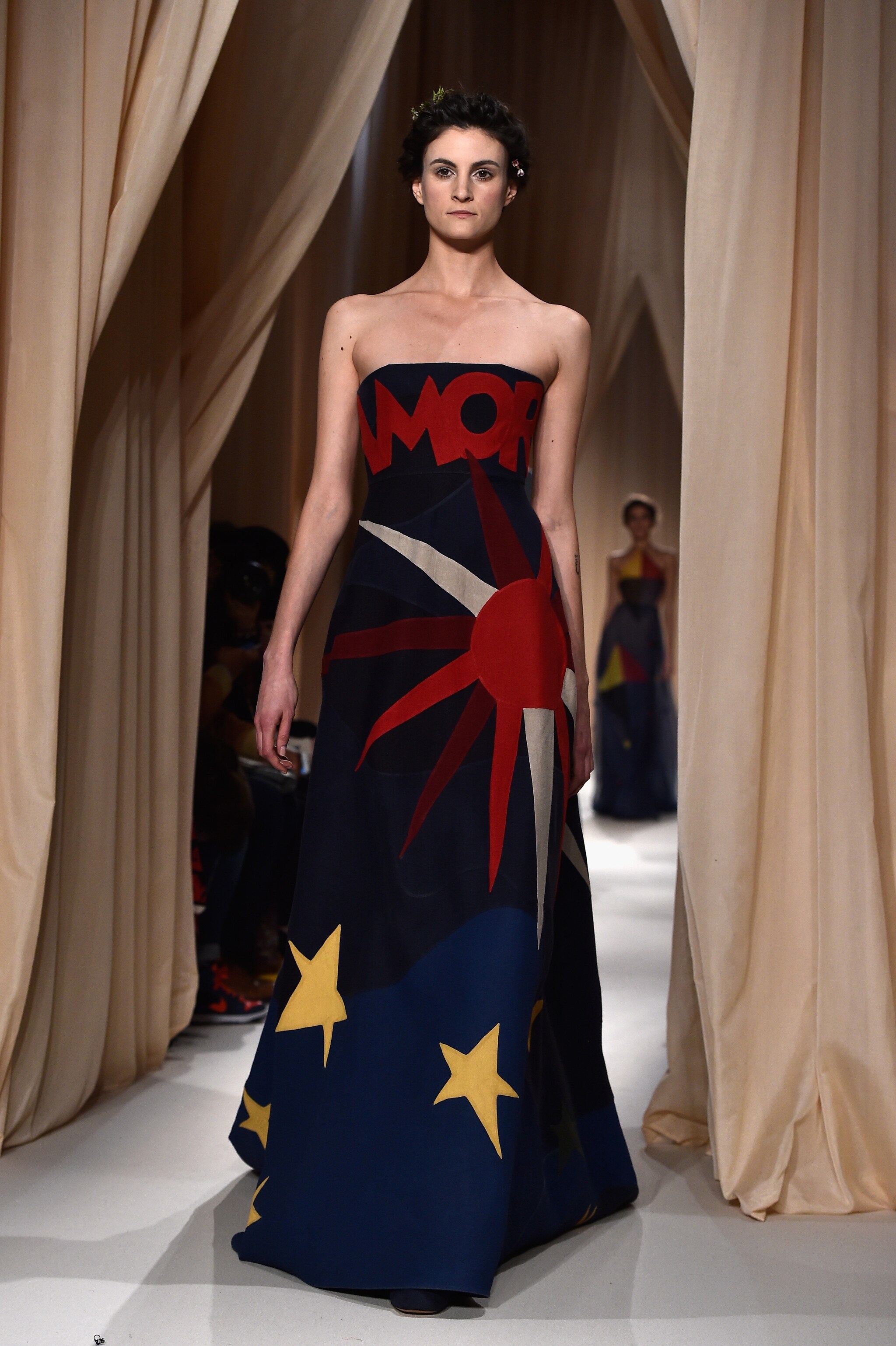 Chiude la Settimana dell'Alta Moda di Parigi la collezione Haute Couture Primavera/Estate 2015 di Valentino. La Maison porta in passerella un vero e proprio inno all'amore, unico sentimento in grado di elevare l'uomo, facendo sfilare abiti decorati con cuori e frasi di poeti e cantautori come Dante e Fabrizio De Andrè