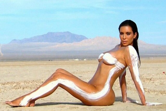 Kim Kardashian ha posato nuda per pubblicizzare l'ultima puntata del reality Keeping Up With the Kardashians. E' stesa nuda su una spiaggia nel deserto e mette in mostra le sue curve mozzafiato. Nonostante abbia il seno coperto da una vernice bianca, lascia davvero poco spazio all'immaginazione.