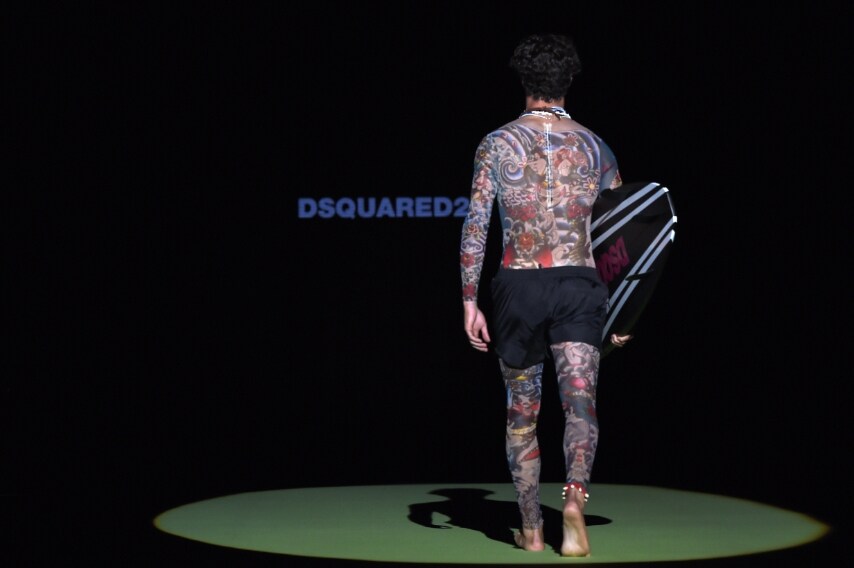 Nell'ultimo giorno di Milano Moda Uomo sfila la collezione primavera/Estate 2016 di Dsquared2. I gemelli Dean e Dan Caten portano in passerella un esercito di surfer tatuati che indossando canotte scollate, short dai colori accesi, cappelli voluminosi e completano il look con scarponcini da montagna e maxi zaini.