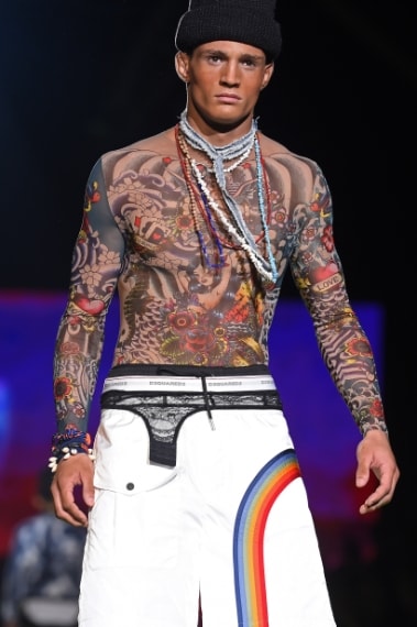 Nell'ultimo giorno di Milano Moda Uomo sfila la collezione primavera/Estate 2016 di Dsquared2. I gemelli Dean e Dan Caten portano in passerella un esercito di surfer tatuati che indossando canotte scollate, short dai colori accesi, cappelli voluminosi e completano il look con scarponcini da montagna e maxi zaini.